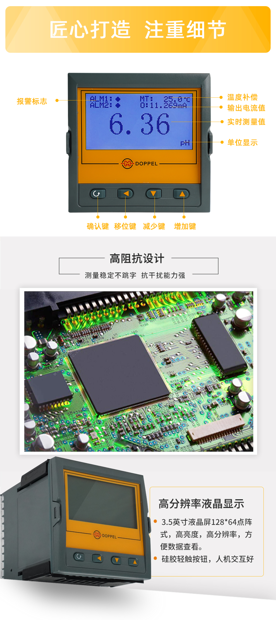 ⑦ 采用低阻抗/高靈敏玻璃膜,有效消除多種幹擾,提升電極靈敏度